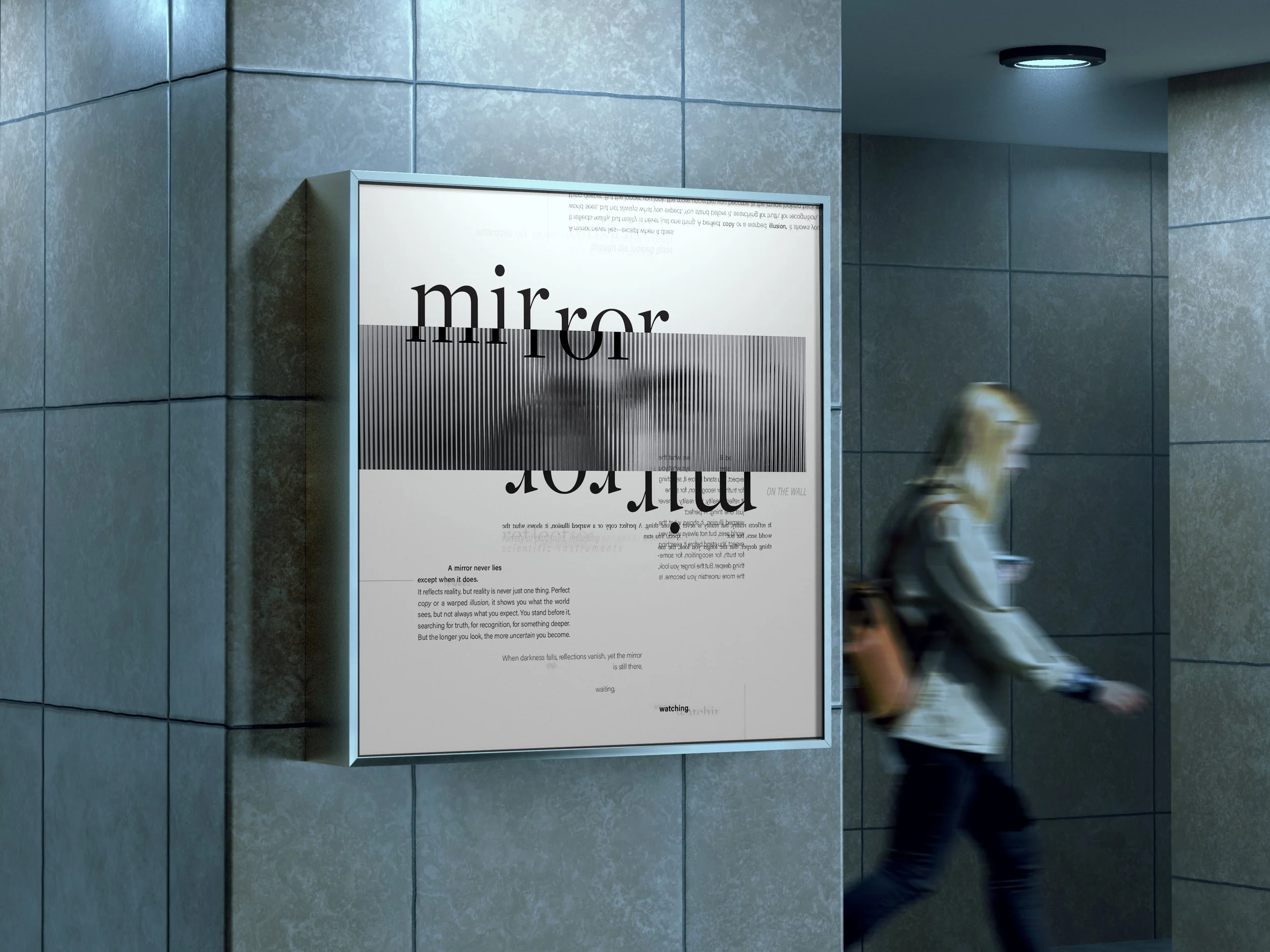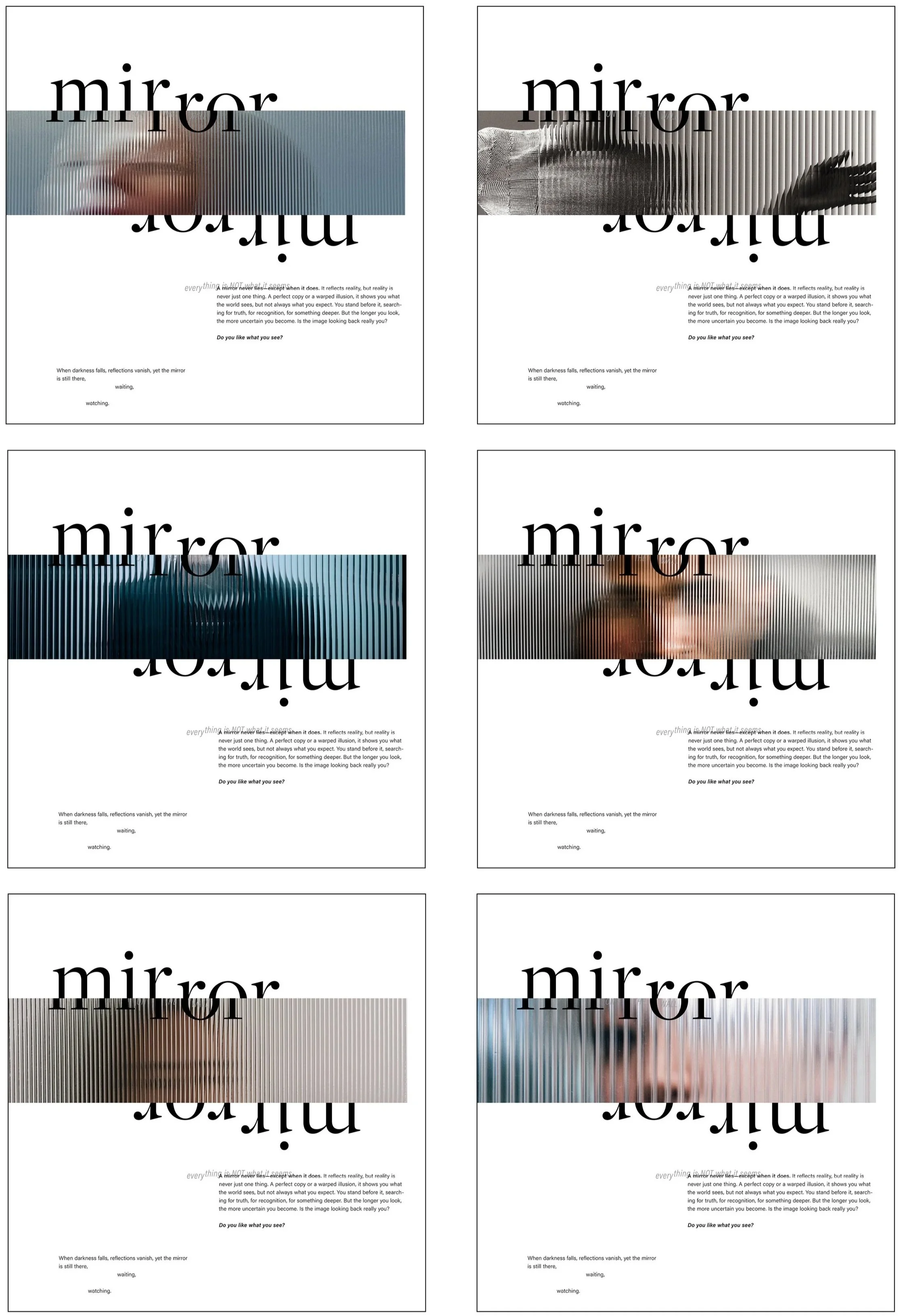 This poster explores the multiple meanings and cultural significance of the word mirror, visually reflecting its dual nature—clarity vs. distortion. Through mirrored, concealed, and fragmented typography, along with layered imagery, the design examines how mirrors can reflect reality as a perfect copy or a distorted illusion, building a sense of uncertainty. The double exposure of a man—one version gazing off to the side, the other staring directly at the viewer—heightens the eerie ambiguity of mirrors. Inspired by David Carson’s approach to legibility and illegibility, the typographic treatment further blurs the line between perception and obscurity. The composition also evokes the unsettling presence of two-way mirrors, suggesting that while you are looking, you may also be watched.