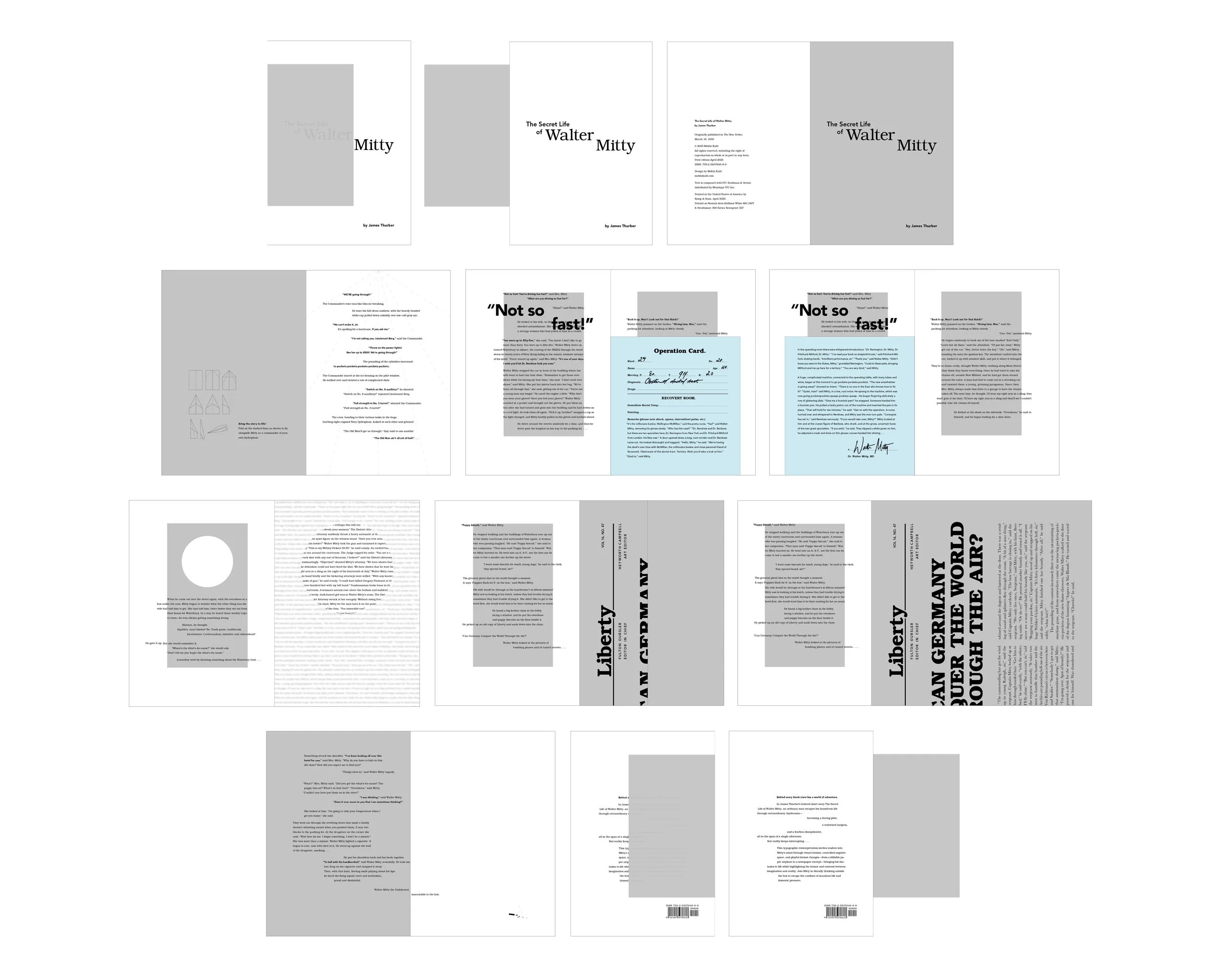 This reinterpretation captures the tension between Walter Mitty’s inner world and external routine through expressive typography and playful format changes. Text is initially restrained within grey boxes and surrounded by negative space, reflecting the quiet pressure of Mitty’s day-to-day life. As his fantasies grow more intense, the text escapes the boxes, scale shifts, and unexpected formats appear. These format changes bring Mitty’s imagination to life and reflect the thrill, absurdity, and urgency of his inner world pushing against the limits of the real one.