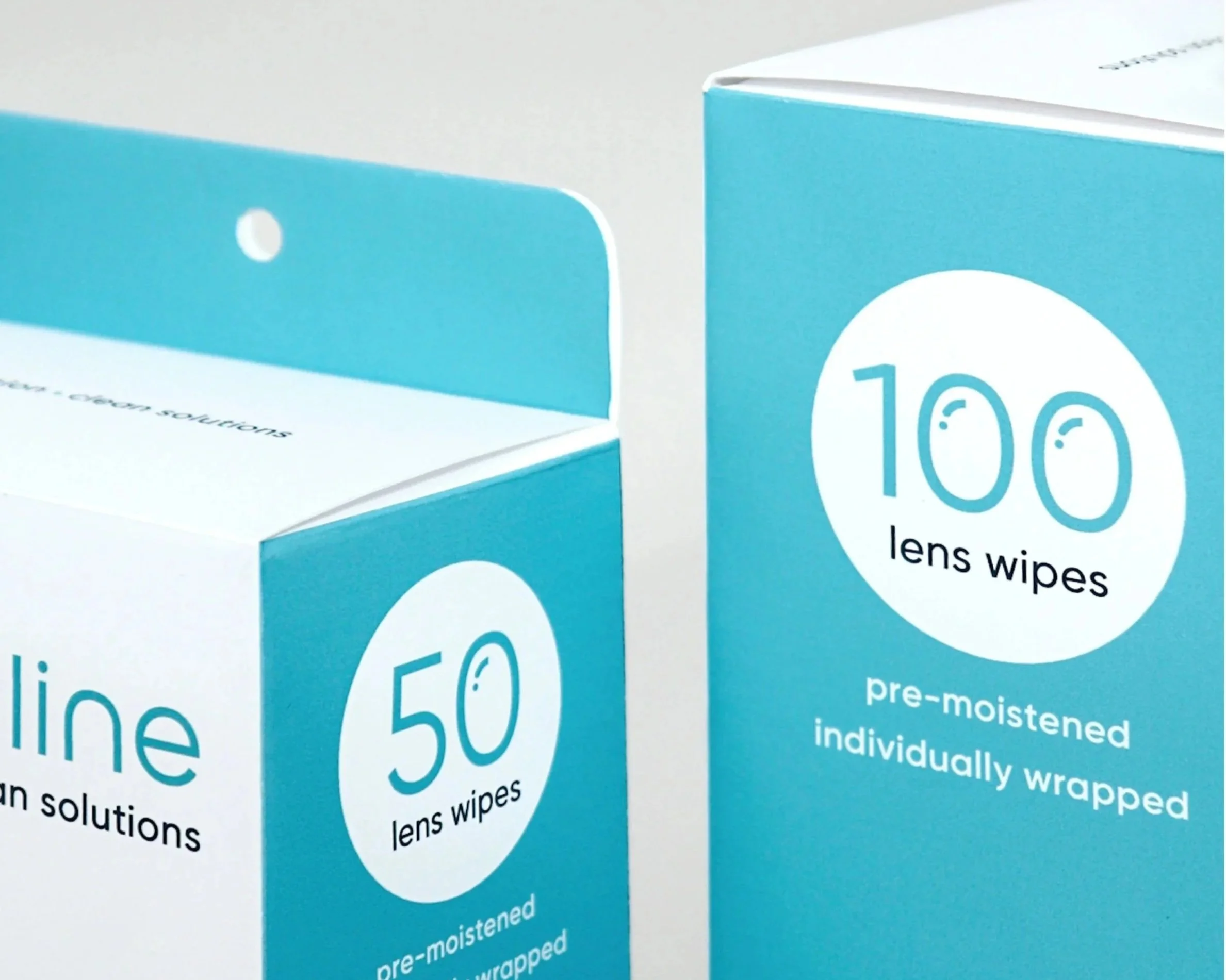Front of lens wipes box before and after revisions. As someone drawn to sans-serifs, I pushed myself to explore a serif design first (left). While effective, the revision to sans-serif (right) ultimately improved readability and gave the packaging a cleaner, more brand-appropriate presence.