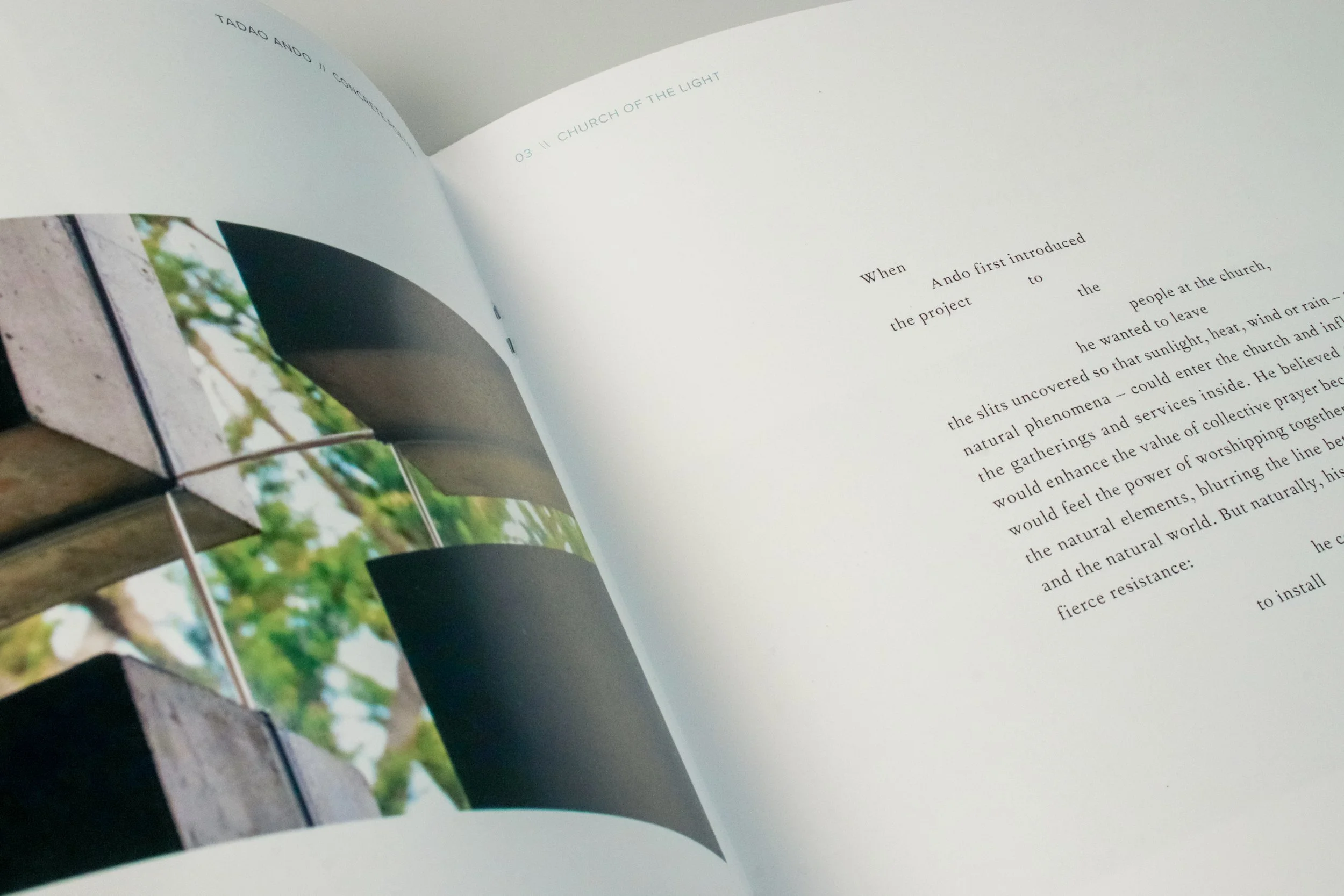 The cover features a die-cut inspired by the cross-shaped cutout in his Church of the Light, allowing natural light to pass through. This interactive detail bridges nature with the booklet itself, creating an experience that extends beyond the printed page.