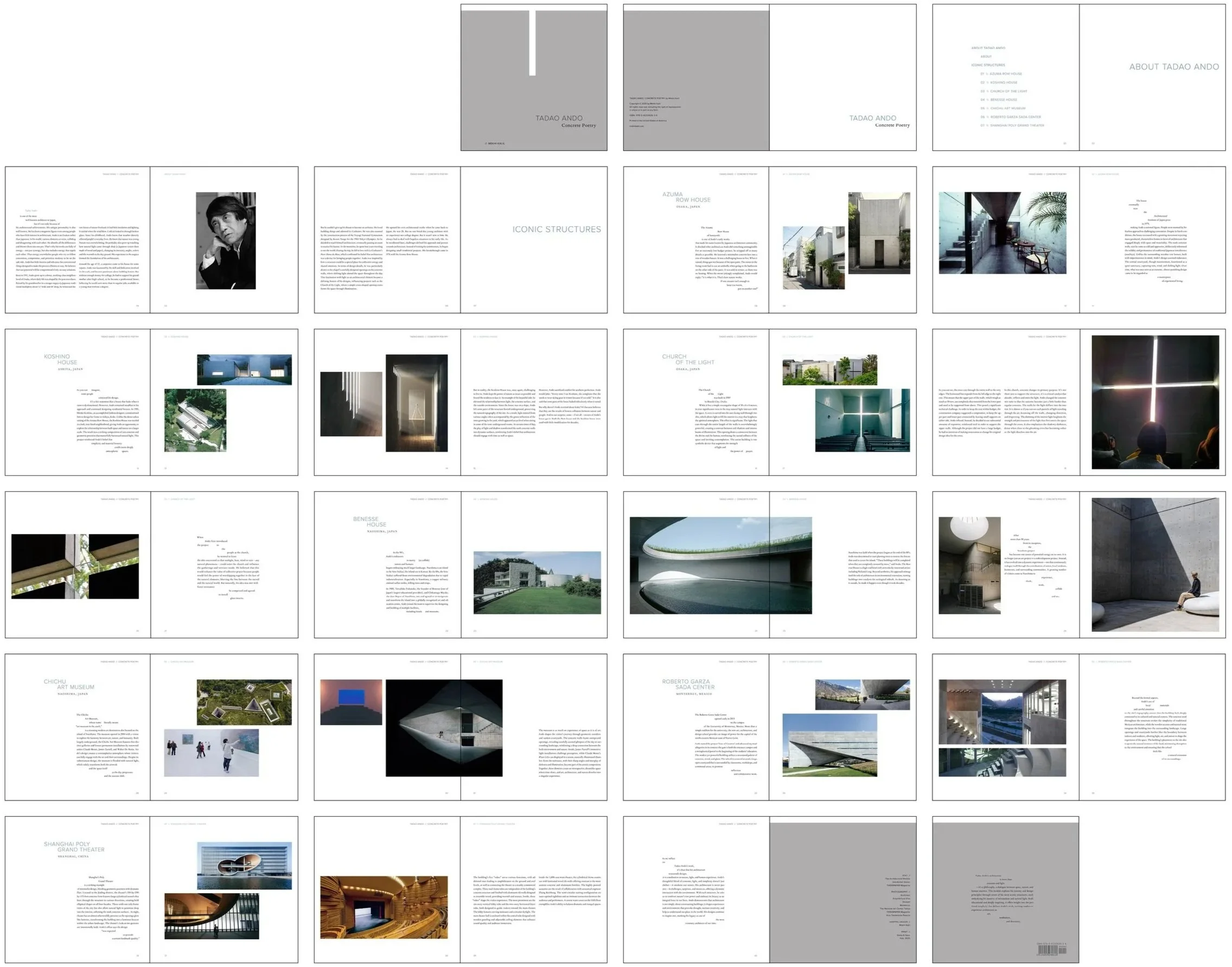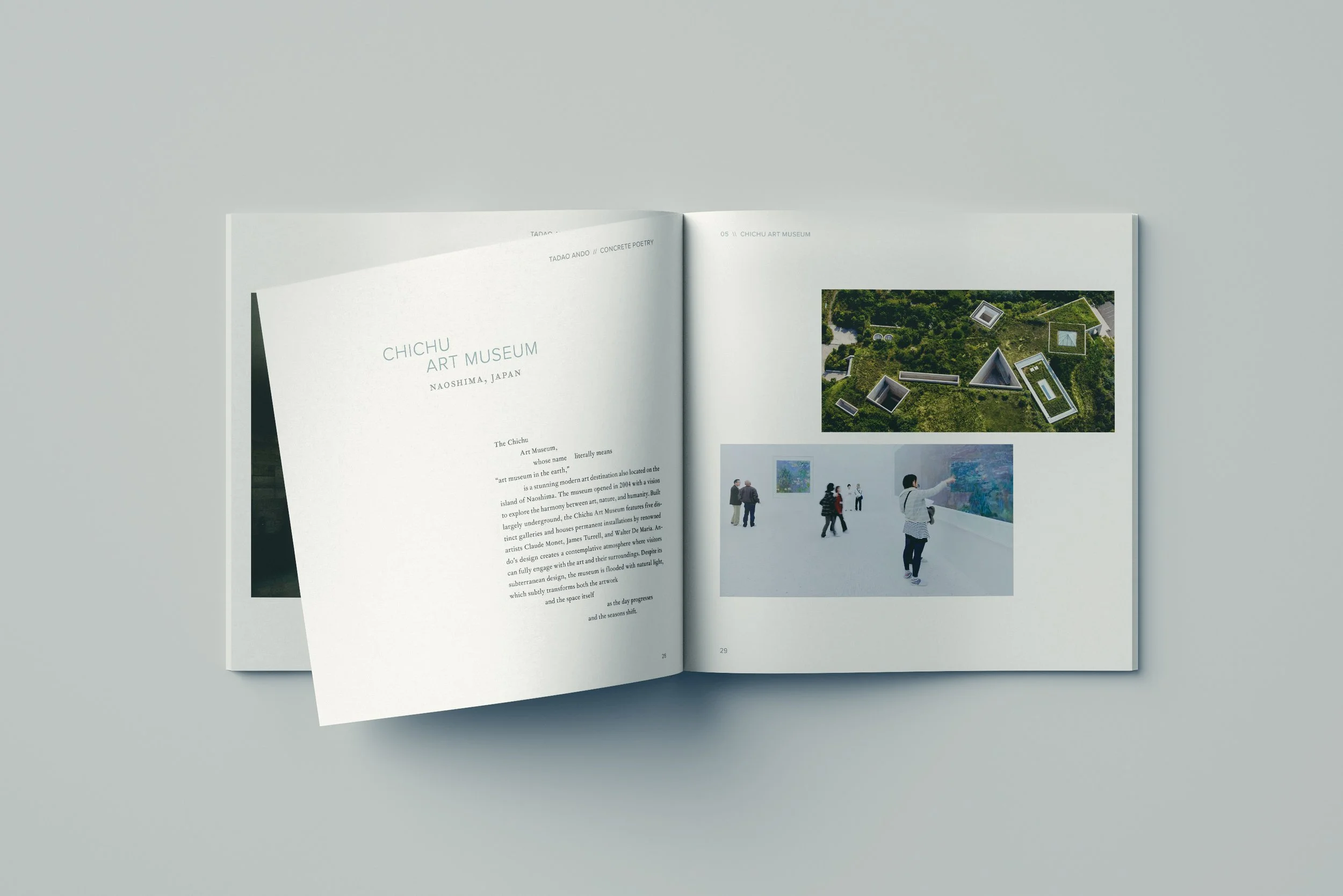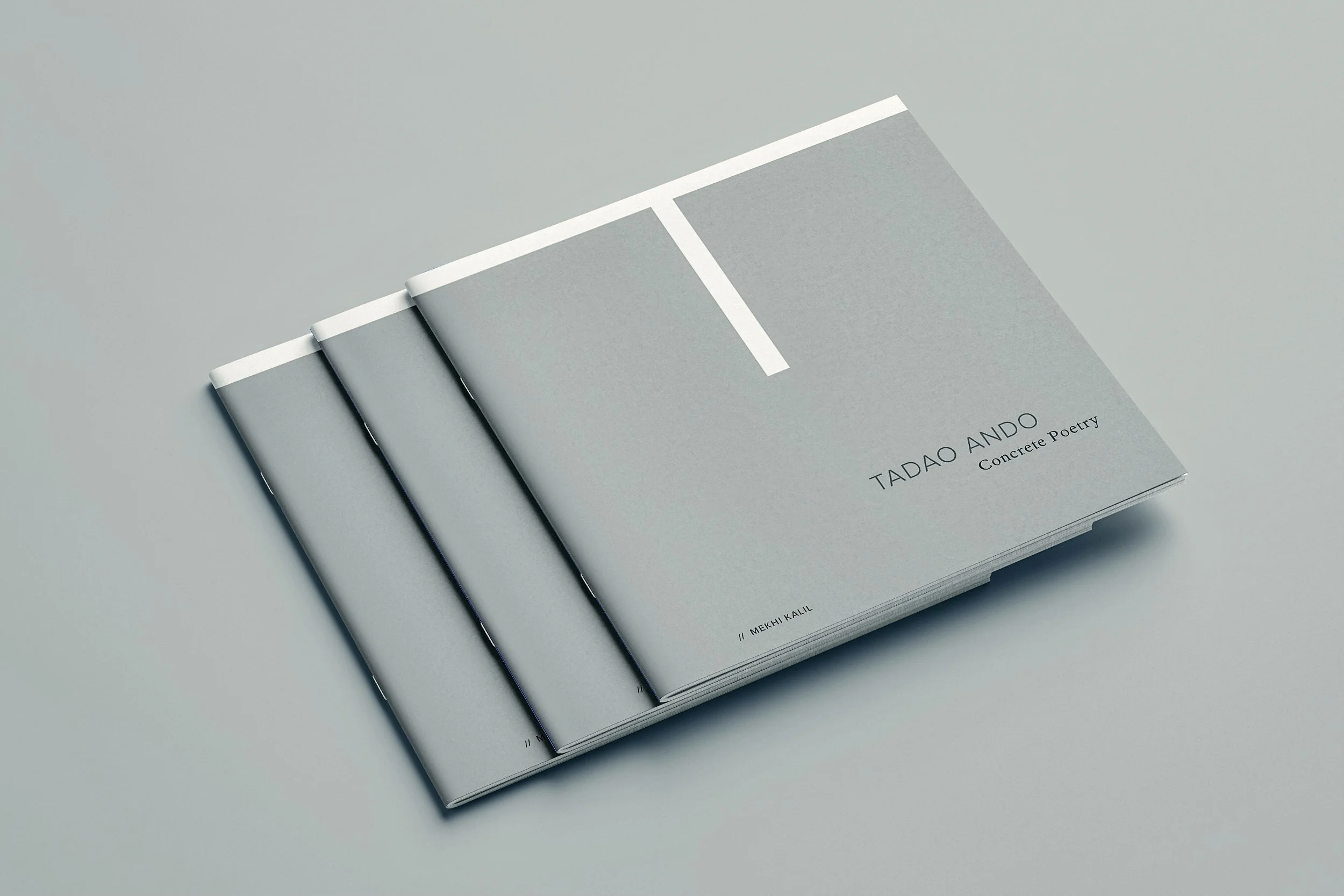 The design of this booklet mirrors Ando’s architectural ethos. A restrained yet dynamic use of negative space reflects the atmospheric qualities of his structures, allowing for a sense of stillness and contemplation. The layouts are composed with a quiet rhythm echoing Ando’s ability to harmonize rigid geometric forms with natural elements.