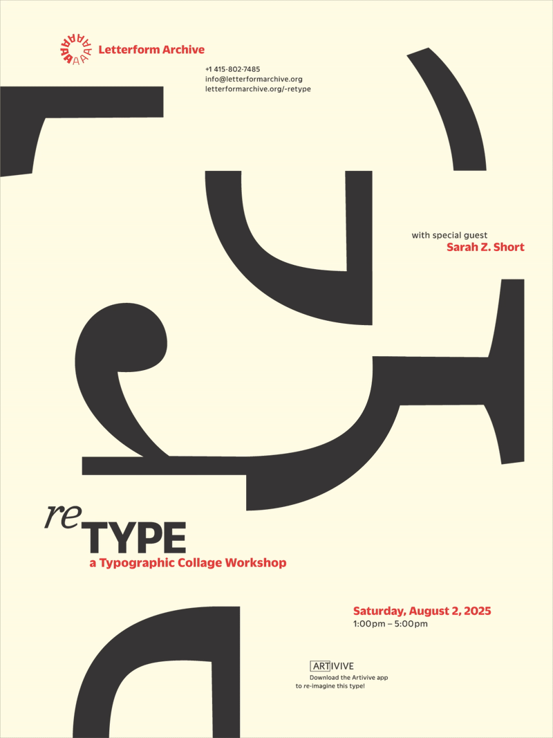 reTYPE, a fictional workshop hosted by Letterform Archive invites participants to explore typography as a medium for collage and abstract art. Rather than treating letterforms solely as vessels for legibility, reTYPE encourages attendees to cut, flip, layer, and recontextualize type into unique compositions. Special guest Sarah Short—an artist and printmaker from Rhode Island known for her incredible typographic collage work—joins the event to share her process and inspire participants.